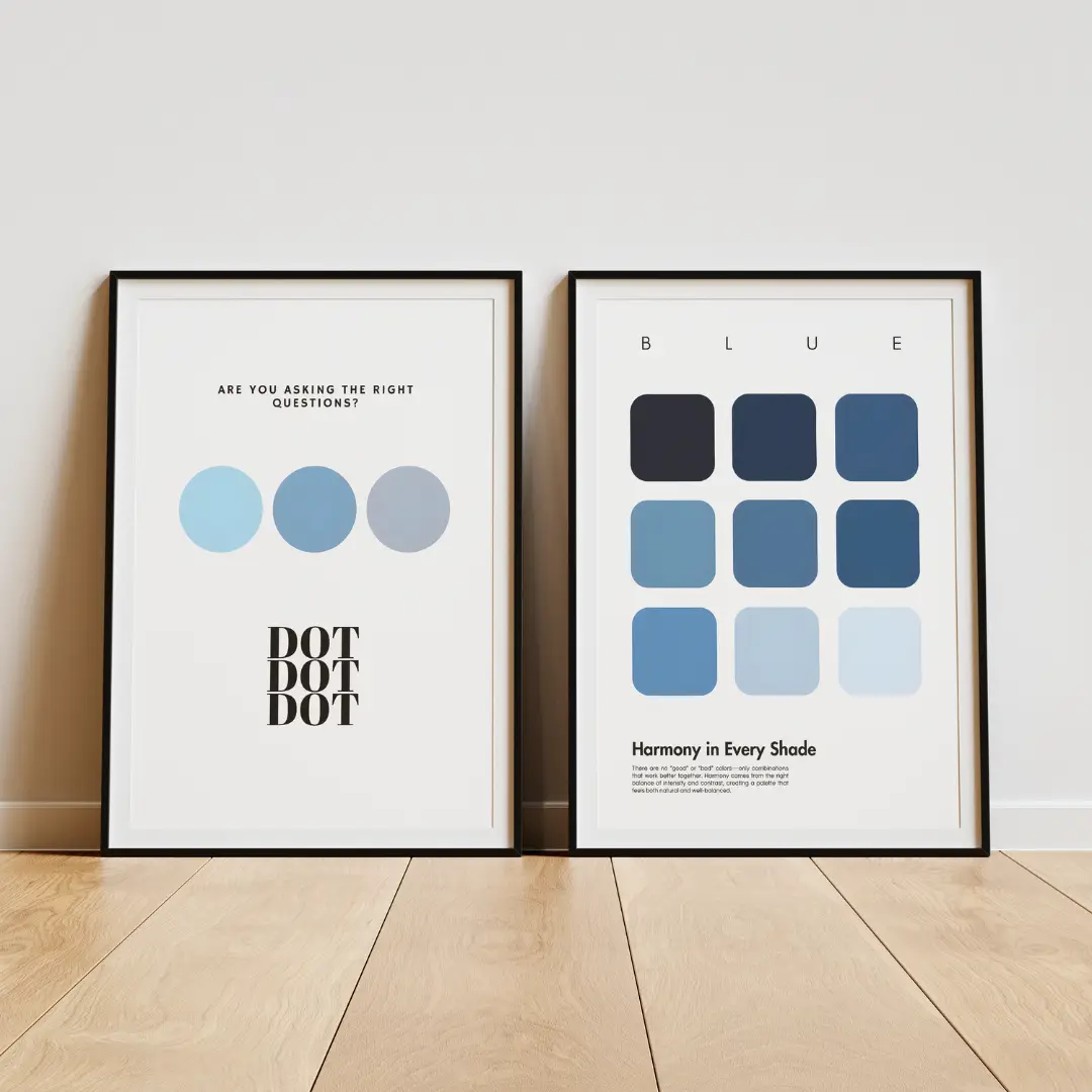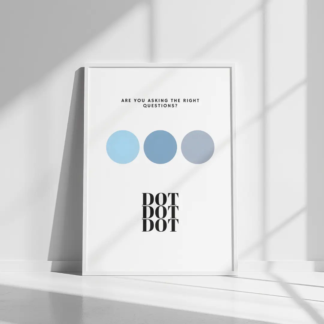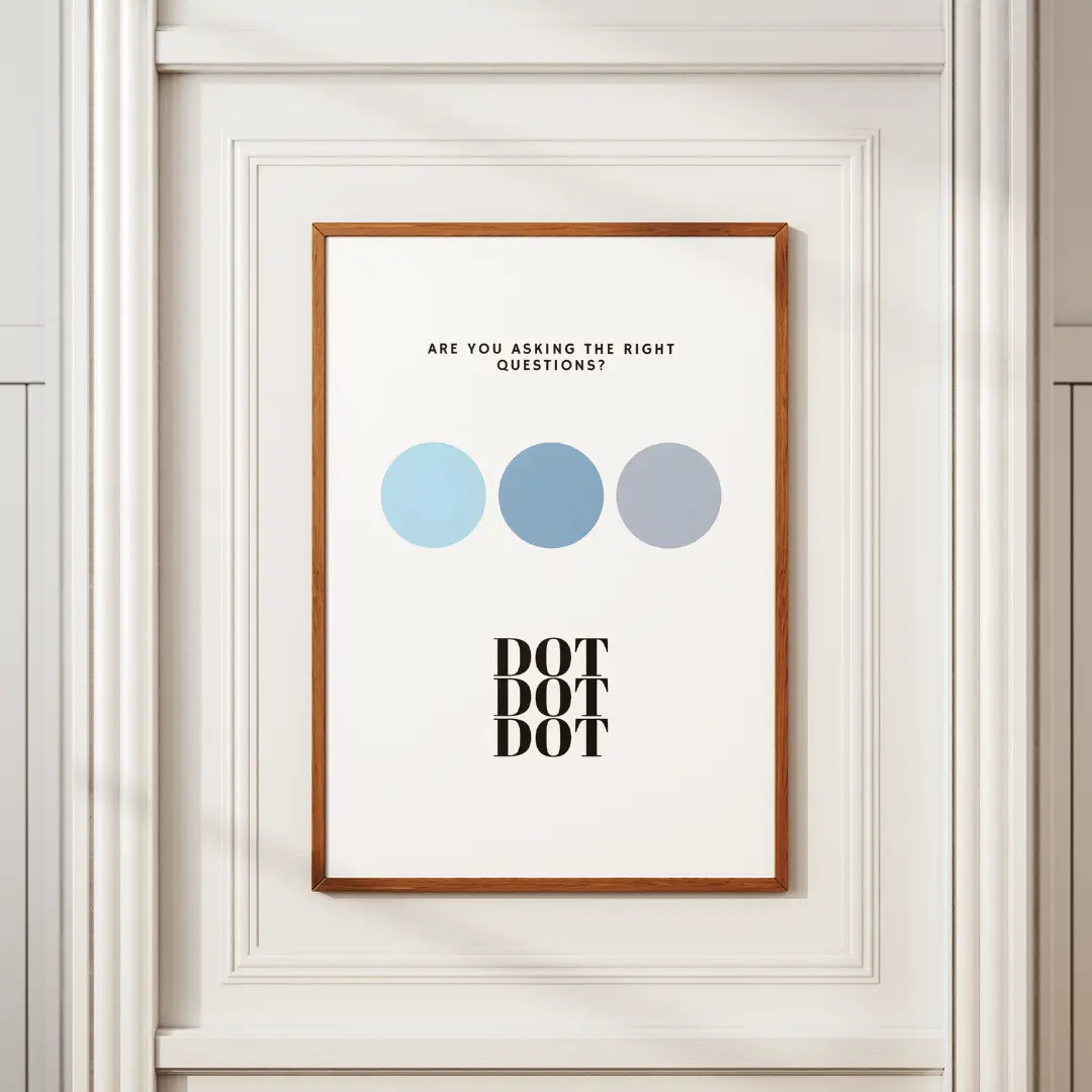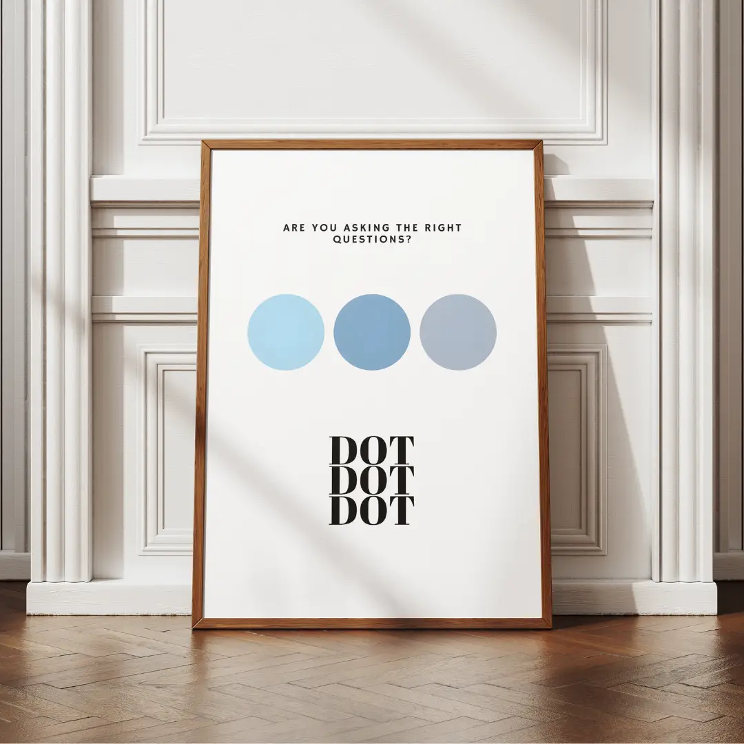 The “Are You Asking the Right Questions?” poster from the Dot Dot Dot series challenges perspectives and invites introspection. Featuring calming blue tones, this abstract design blends seamlessly into contemporary spaces while adding a touch of intellectual intrigue.