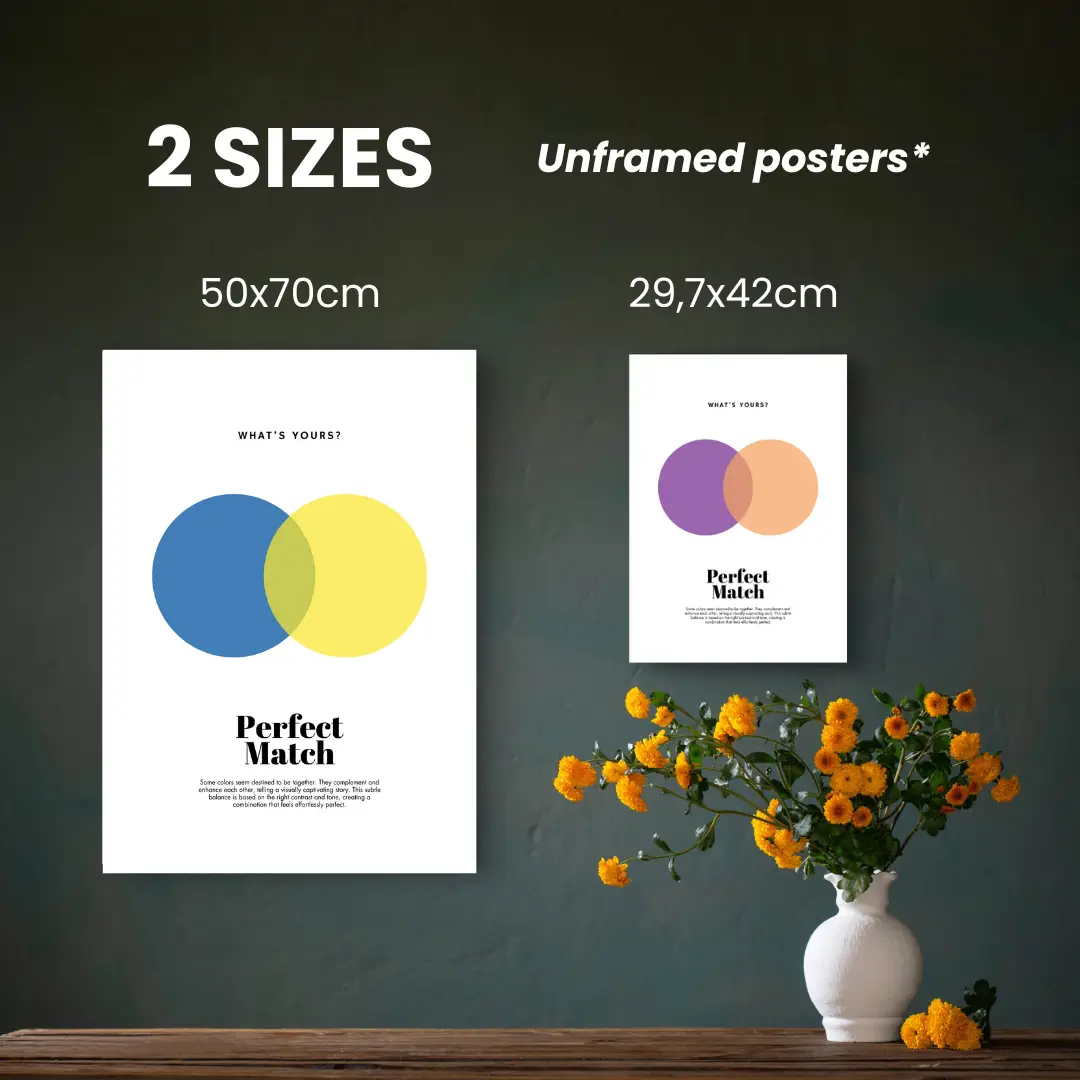 This “Perfect Match” poster beautifully blends soft sky blue with pastel yellow, creating a sense of balance and tranquility. Ideal for brightening up any room, these colors inspire creativity and a fresh perspective, making it a must-have for minimalists and art lovers alike.