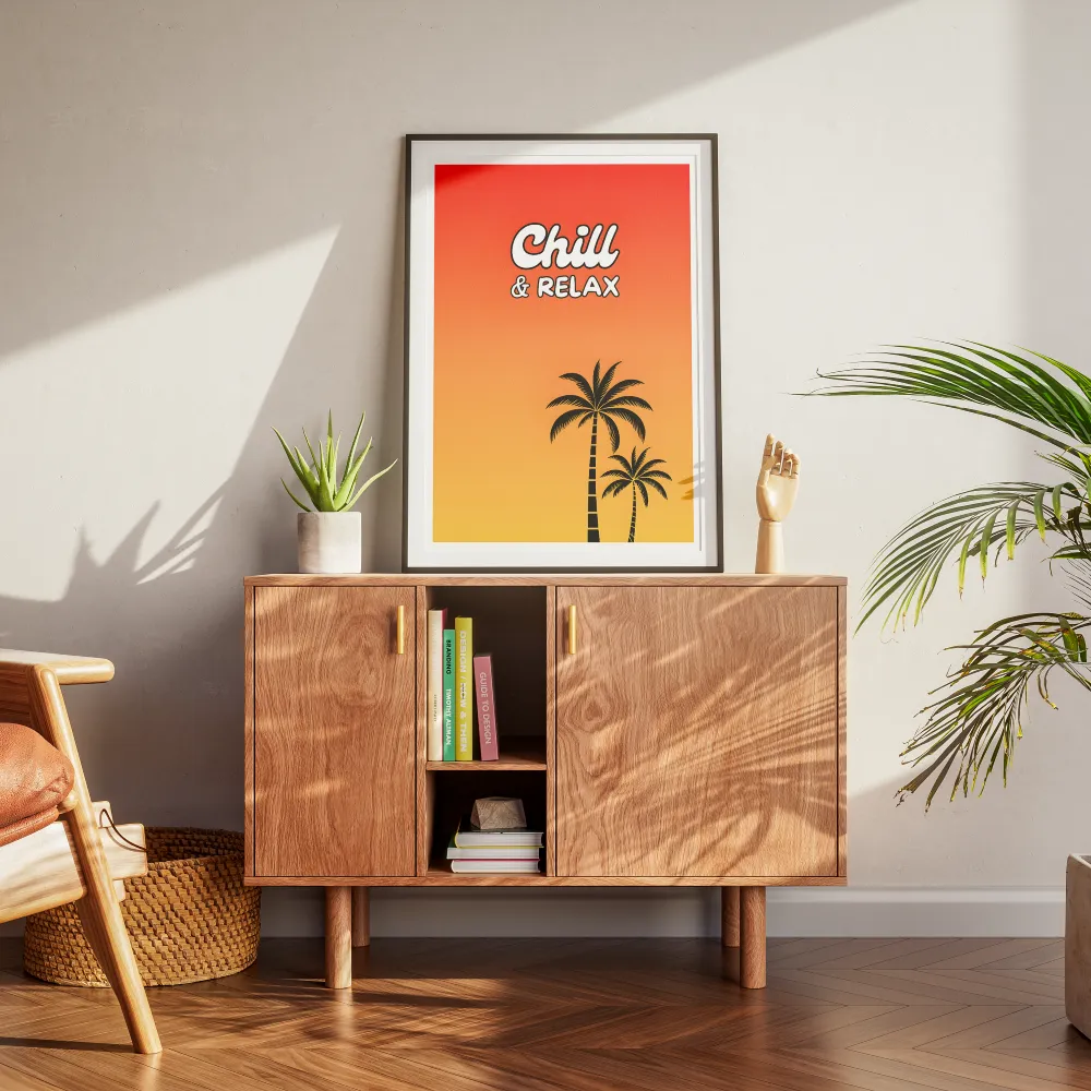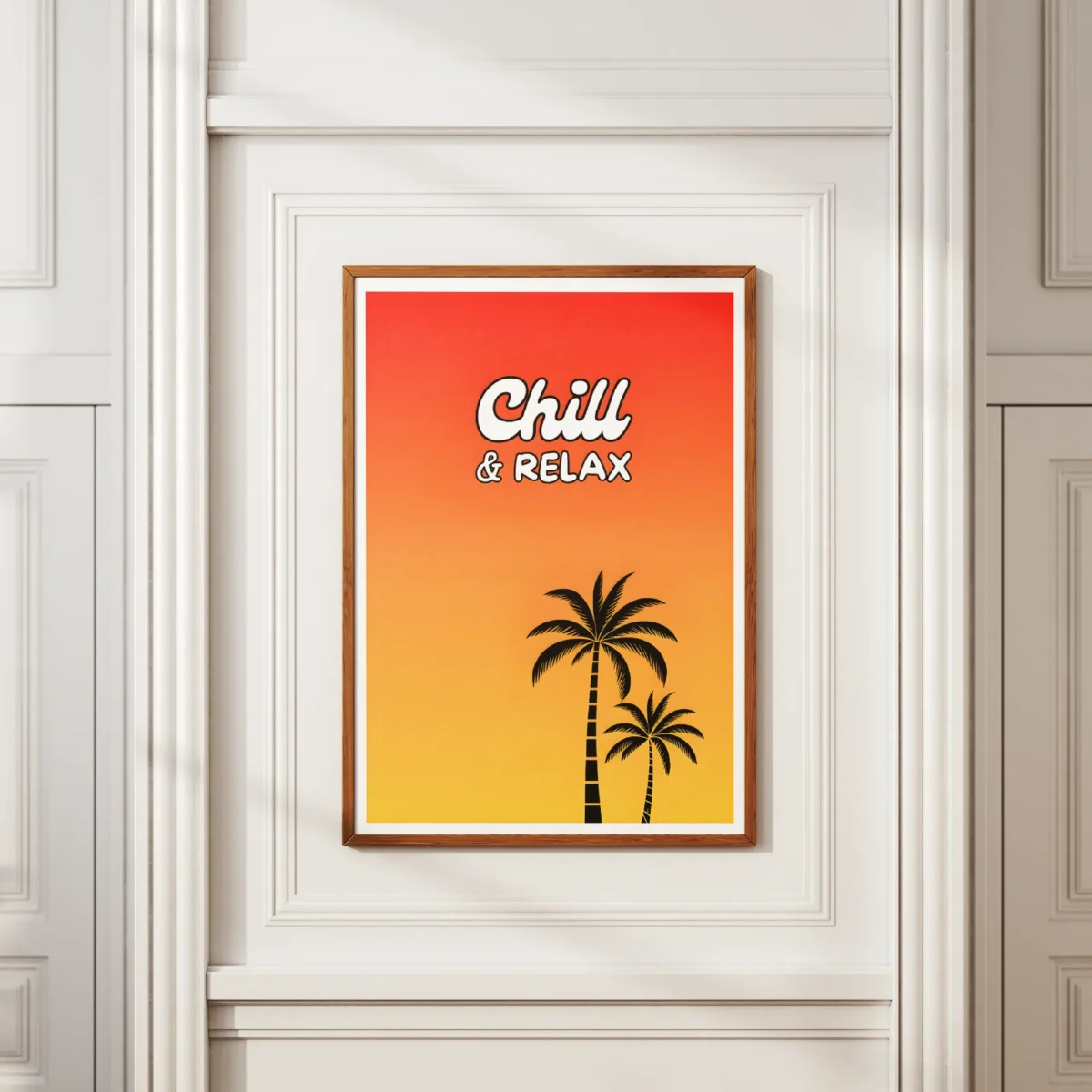 Add a touch of calm and summer to your space with the “Chill & Relax” Poster, a vibrant and modern design that instantly transports you to a tropical paradise. This bold piece features a glowing sunset gradient background, transitioning from warm reds to soft yellows, and two striking black palm trees that exude serenity.