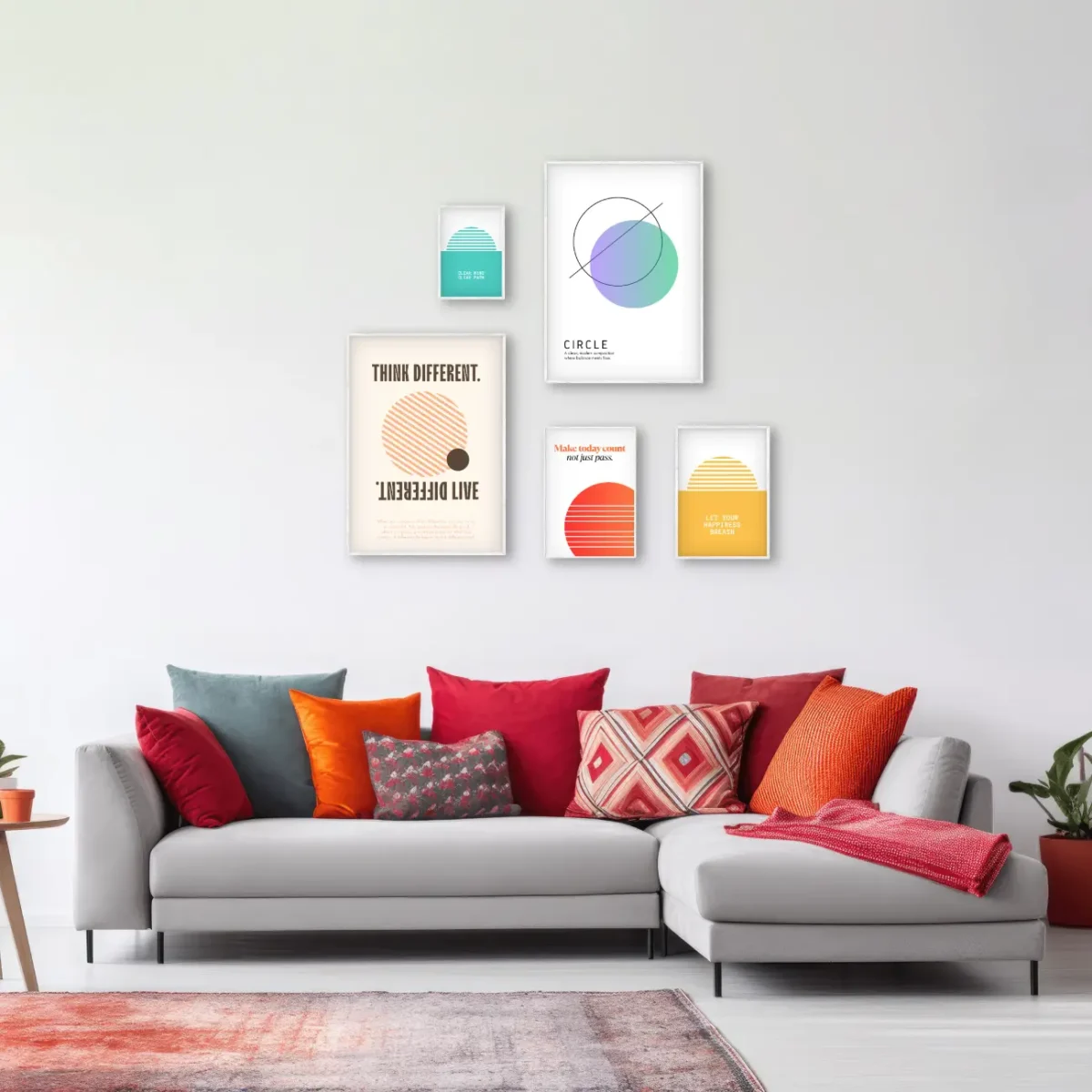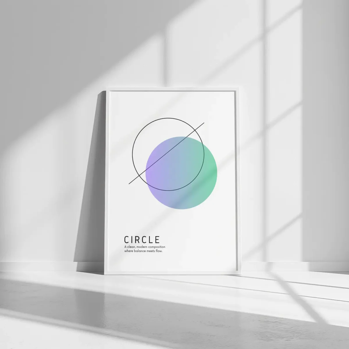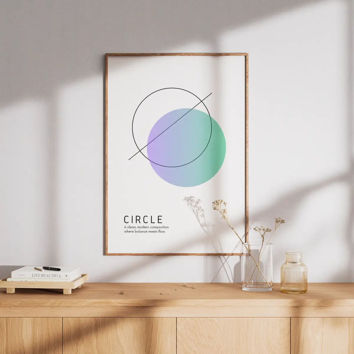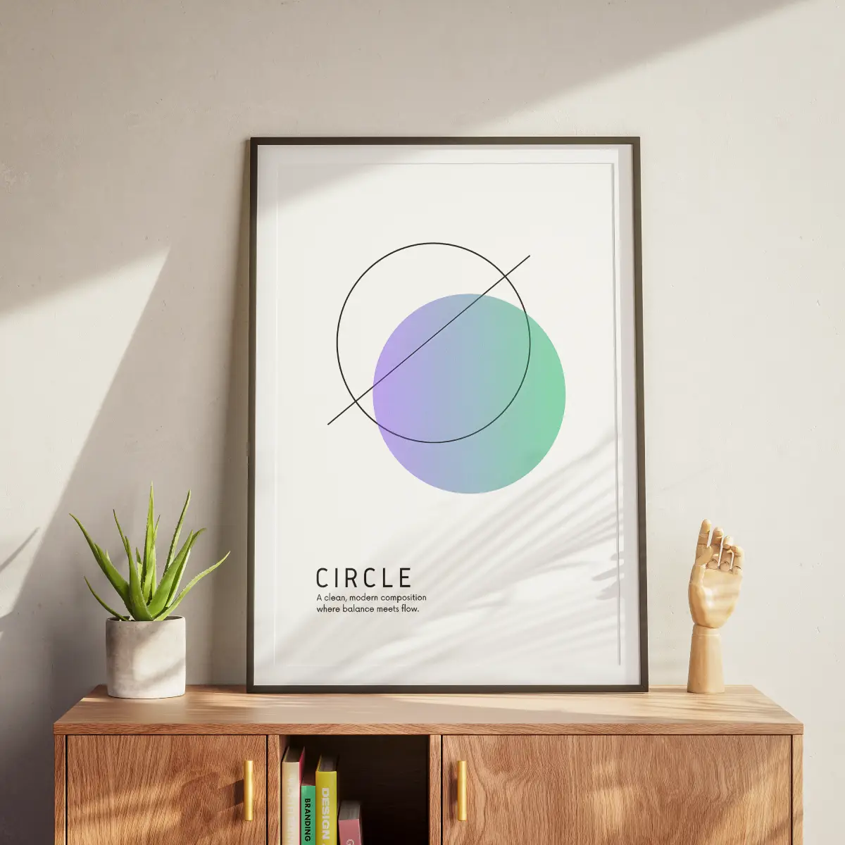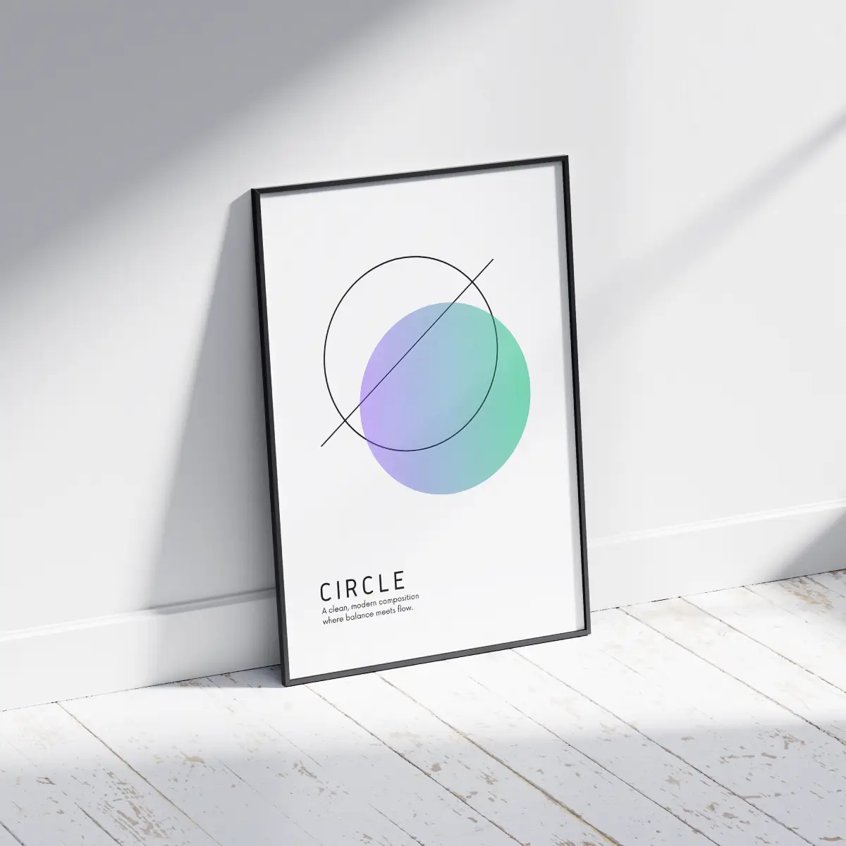 CIRCLE is a modern art print featuring a geometric overlay of purple to green gradients and precise black line work. It evokes clarity, simplicity, and balance—perfect for contemporary interiors, minimalist walls, or creative environments. Its clean, modern look encourages calm and visual flow.