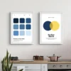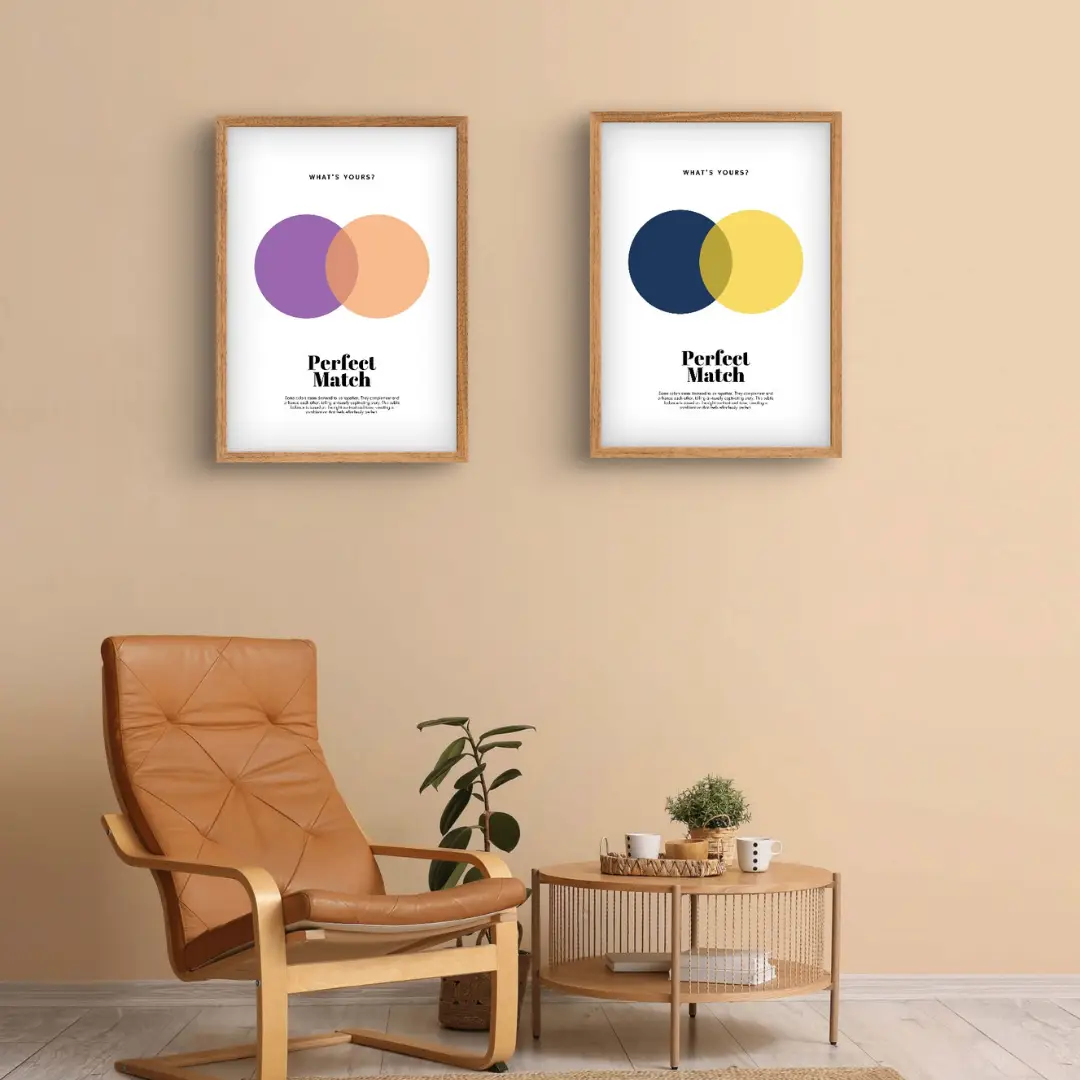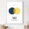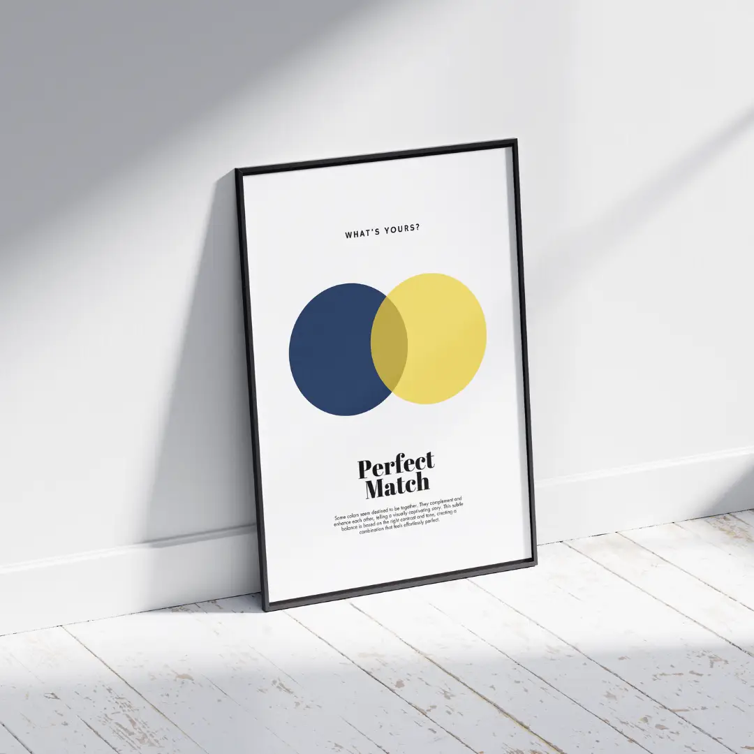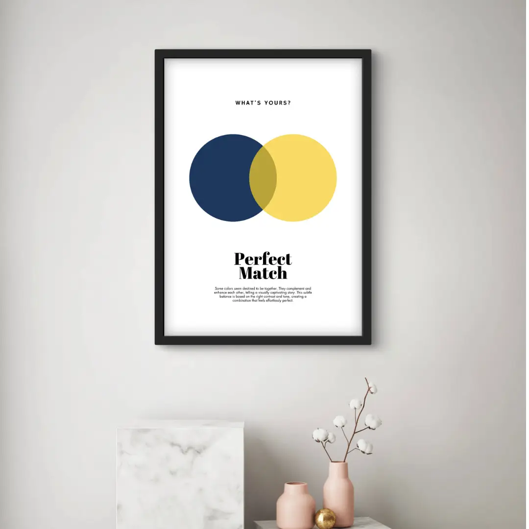 The strong contrast between navy blue and mustard yellow in this “Perfect Match” poster makes it an eye-catching and versatile piece. This color pairing is known for its ability to create depth and visual interest, making it perfect for modern and stylish interiors.