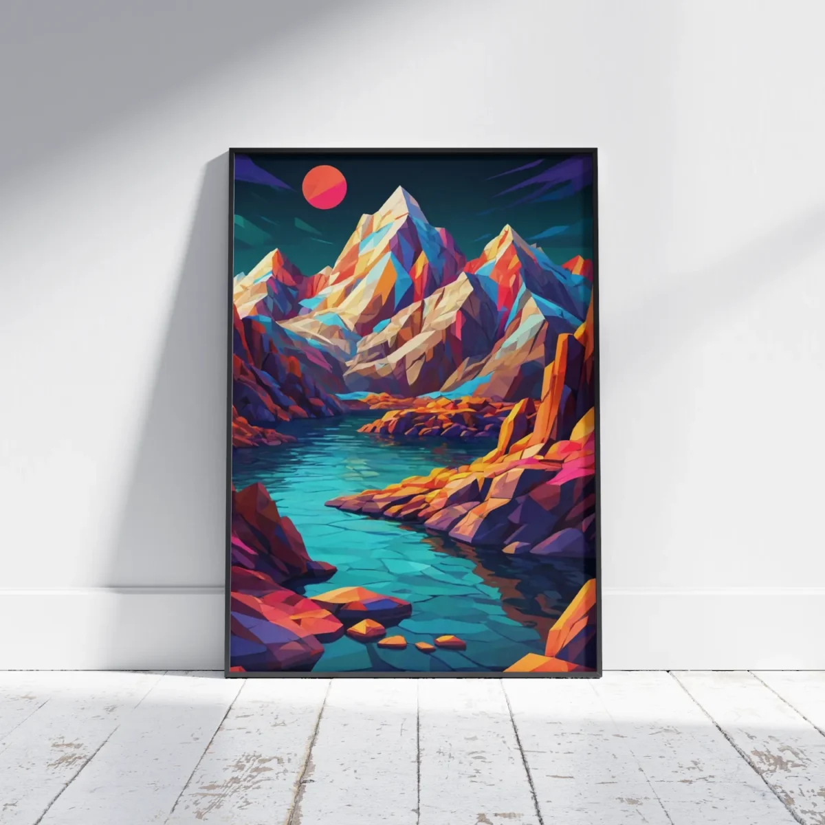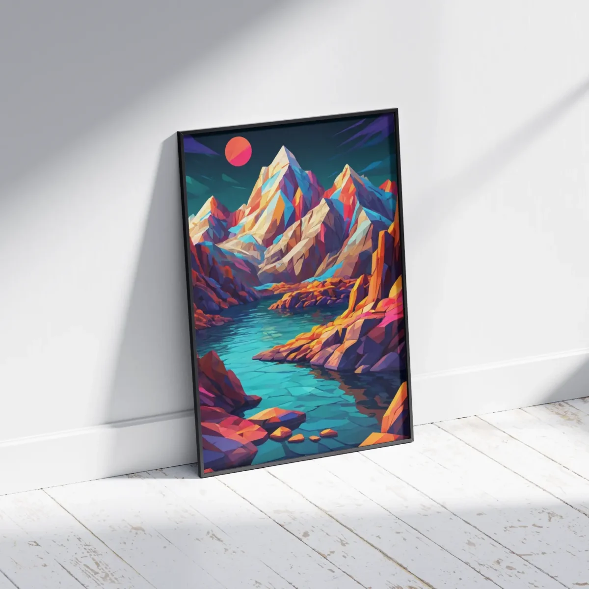 Transform your space with the mesmerizing ‘Orange Moon’ Neon Mountain Landscape Poster, a vibrant piece of PS1-inspired digital cubism wall art that’s sure to catch every eye! This colorful print combines retro aesthetics with modern flair, making it the perfect decoration for game rooms, art enthusiasts, and anyone looking to add a splash of creativity to their home or office.