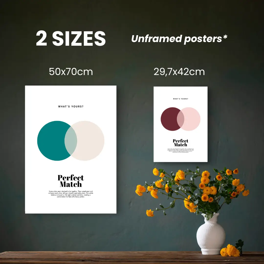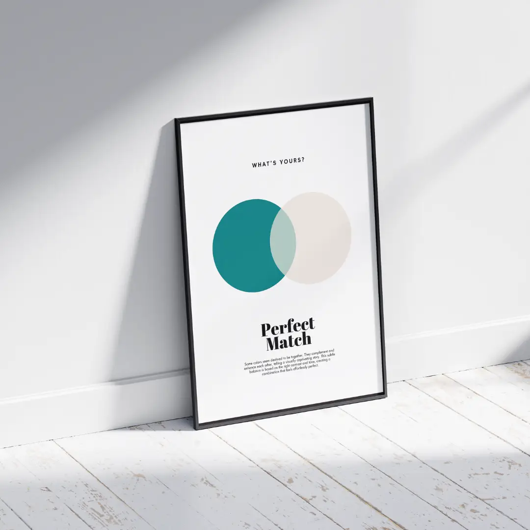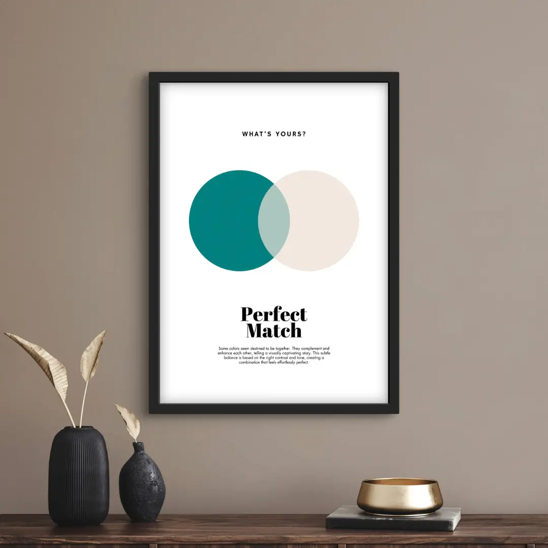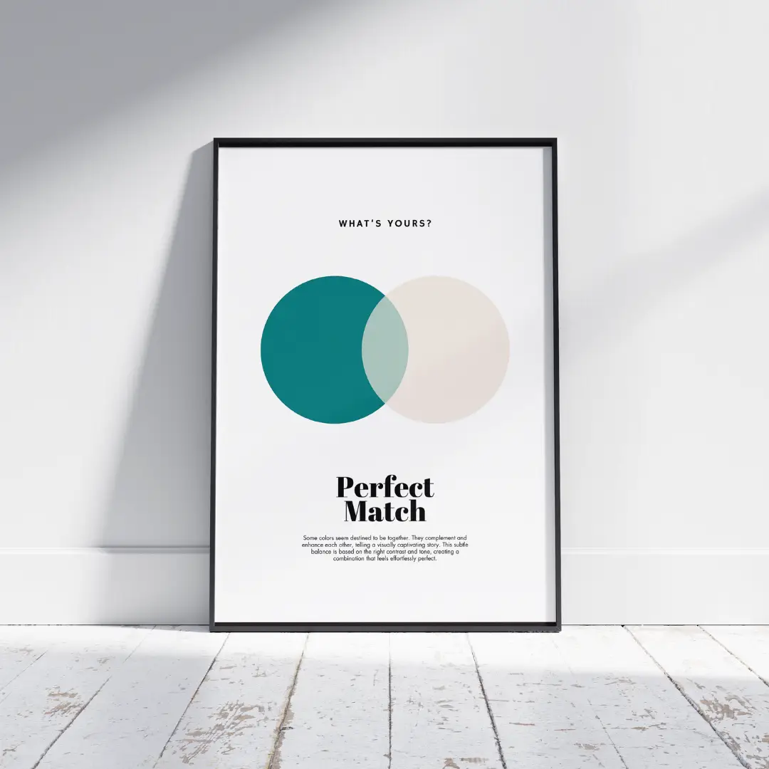The contrast of deep teal and soft cream in this “Perfect Match” poster represents harmony and sophistication. This unique color pairing is perfect for a modern yet calming aesthetic, ideal for contemporary interiors and artistic expression.