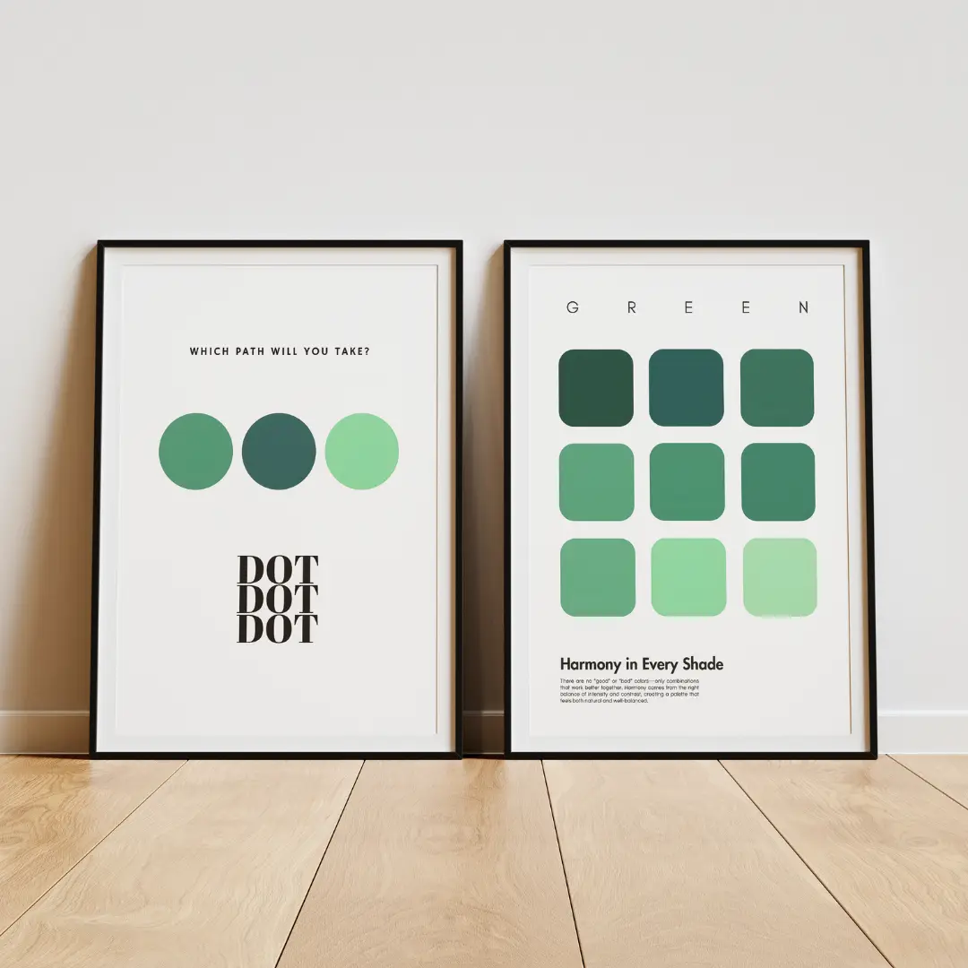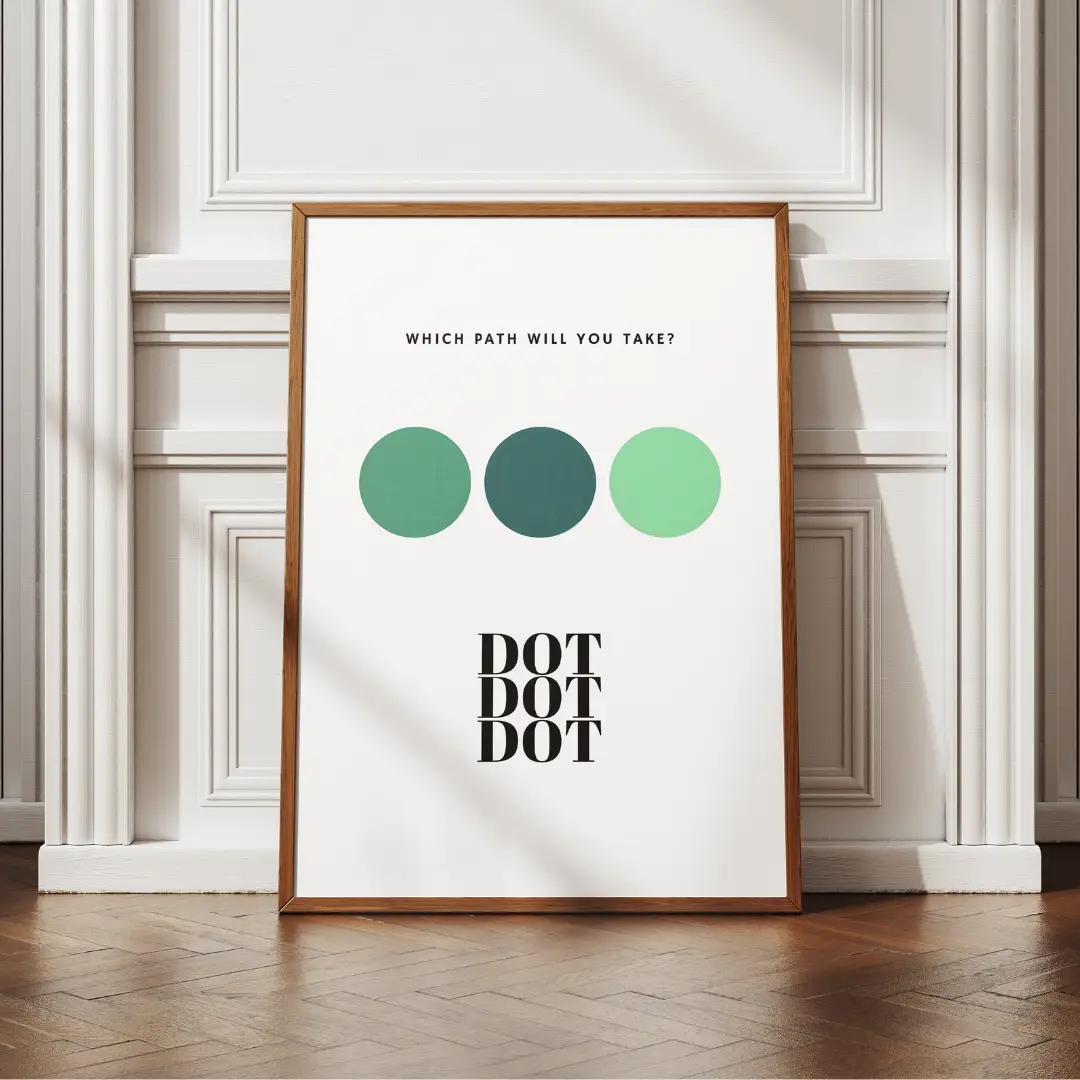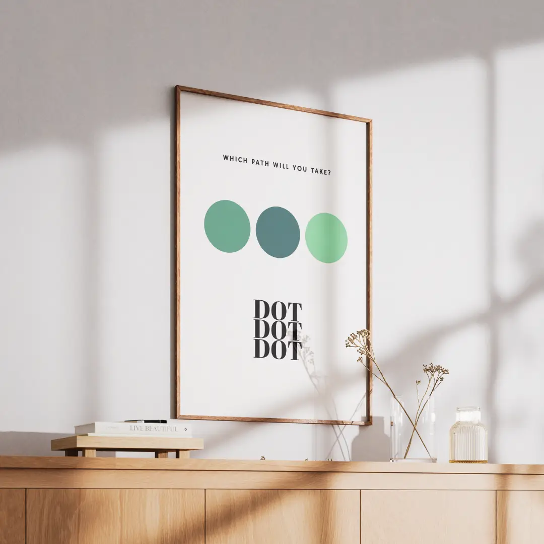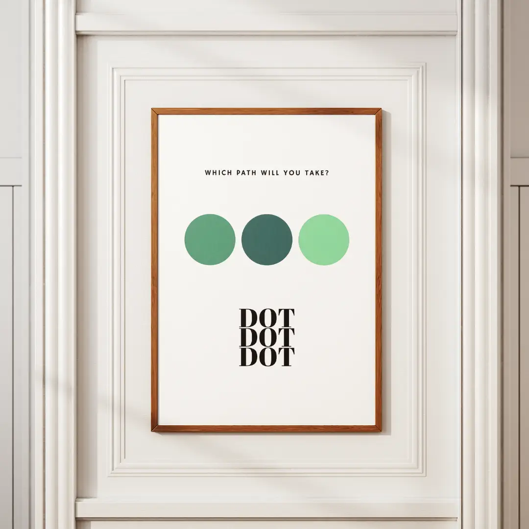 The “Which Path Will You Take?” poster from the Dot Dot Dot series is designed to spark curiosity and self-reflection. Featuring a minimalist composition of green overlapping dots, this artwork represents the endless possibilities life presents. Whether you see it as a symbol of decision-making or an abstract meditation on direction, it’s a unique piece that blends seamlessly into any contemporary home decor.
