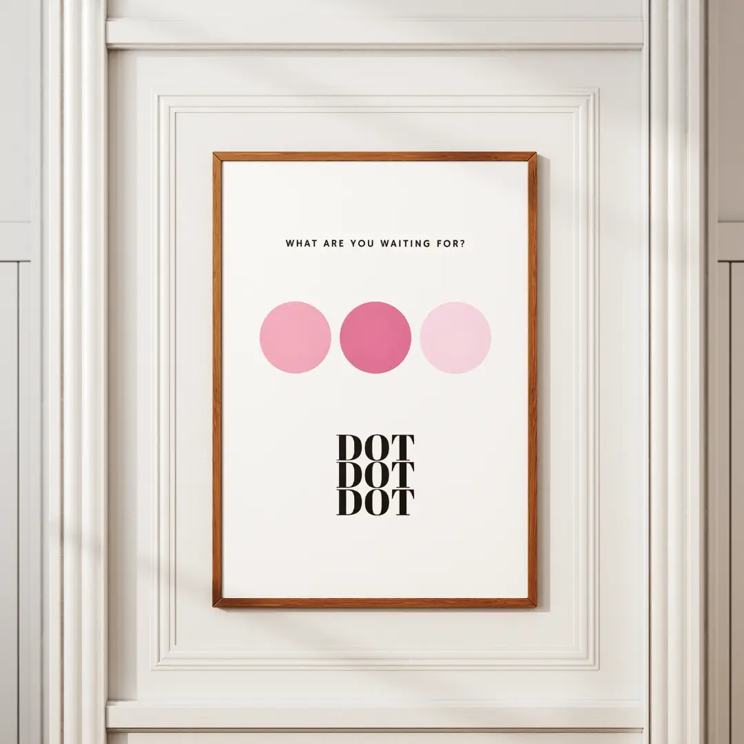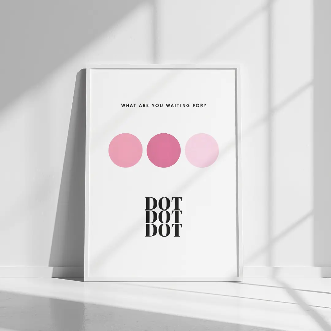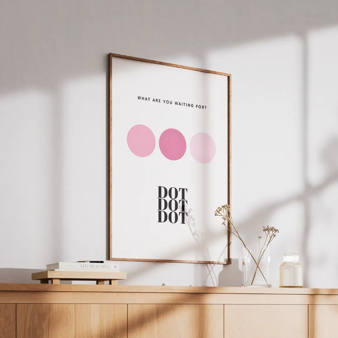The “What Are You Waiting For?” poster from the Dot Dot Dot series is a striking minimalist piece that encourages movement and action. The soft pink hues bring a calming yet inspiring touch to any space, making it an ideal choice for modern interiors.